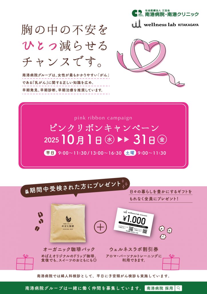 南港病院グループでは「正しい知識の普及」と「乳がん検診の受診率向上」を目的に、ピンクリボンキャンペーン 2025を実施します。