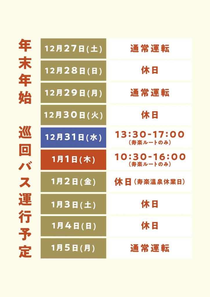 - 12月31日(水) 13:30~17:00(寿楽ルートのみ運行)