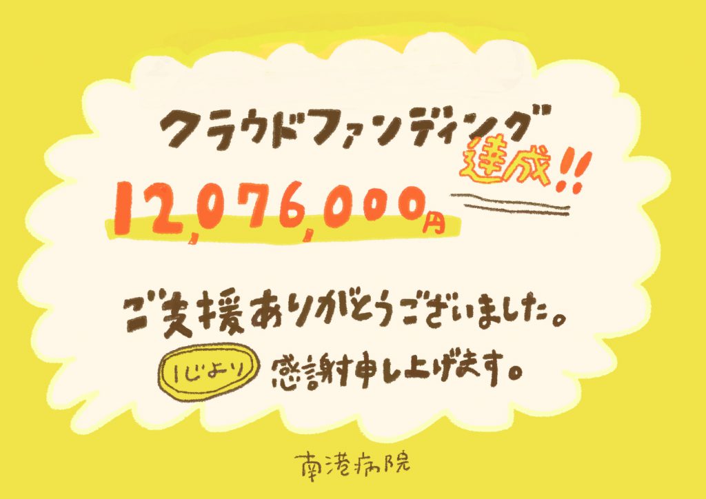 1月より実施してまいりました「南港ユマニテ病院新設」に向けたクラウドファンディングにつきまして、皆さまから多くのご支援と温かい応援をいただき、心より御礼申し上げます。