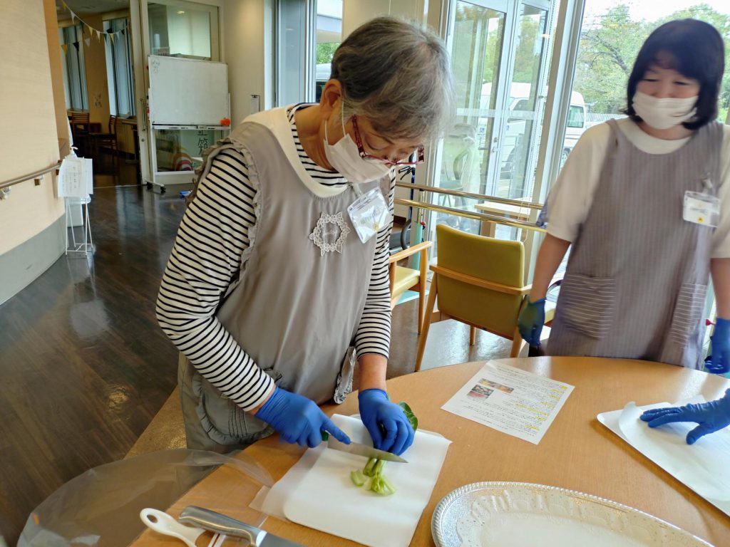 【入居者様】普段はデイルームに入ってこられない当施設の入居者様が、開始前から静かに様子を見守ってくださったり、毎回参加してくださるグループホームの入居者様は「腕が動きますように」と祈りながらも今回も包丁を手に大活躍!
