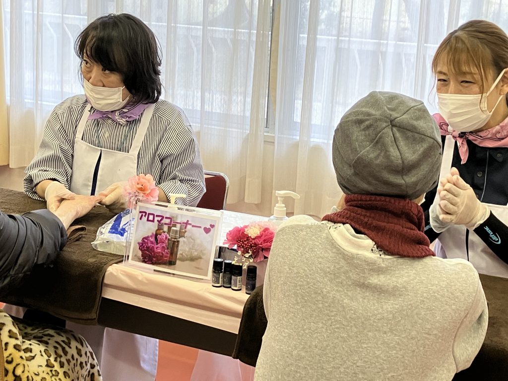 アロマの香りに包まれながら、心身をリラックスさせる体験コーナーも好評でした。