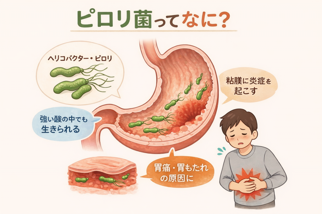 特に、原因がはっきりしないまま症状が続く場合は「ピロリ菌感染」の可能性も考えられます。
