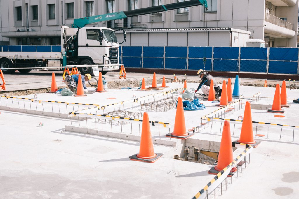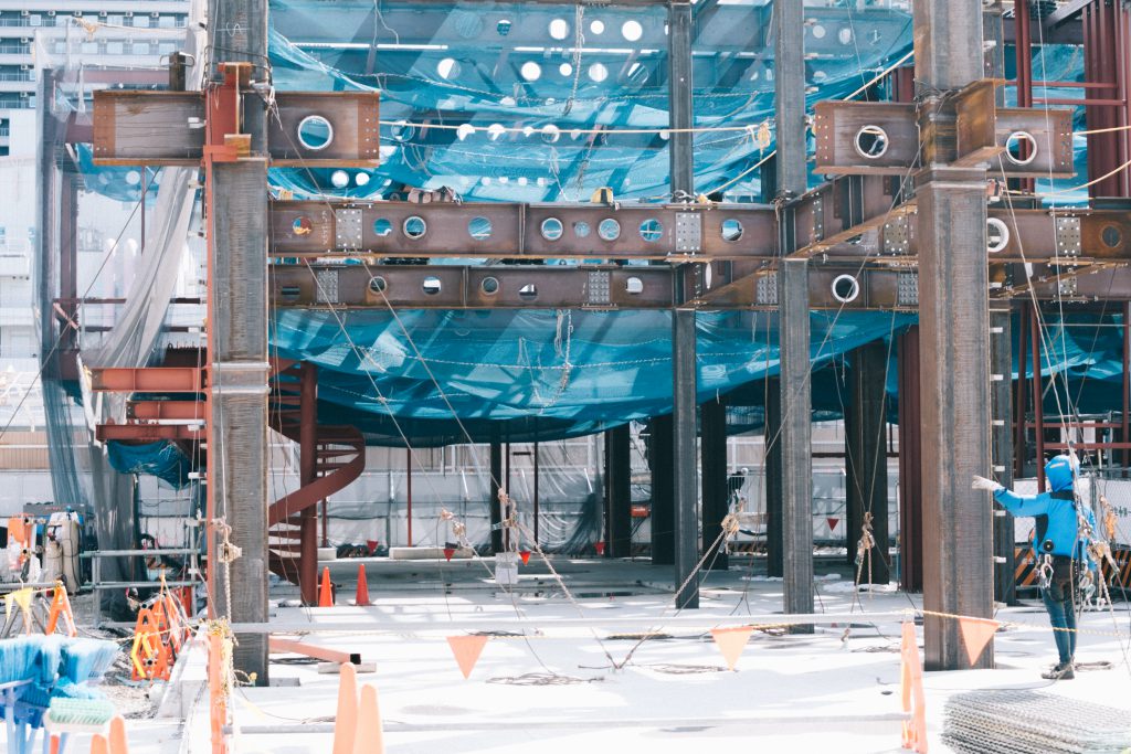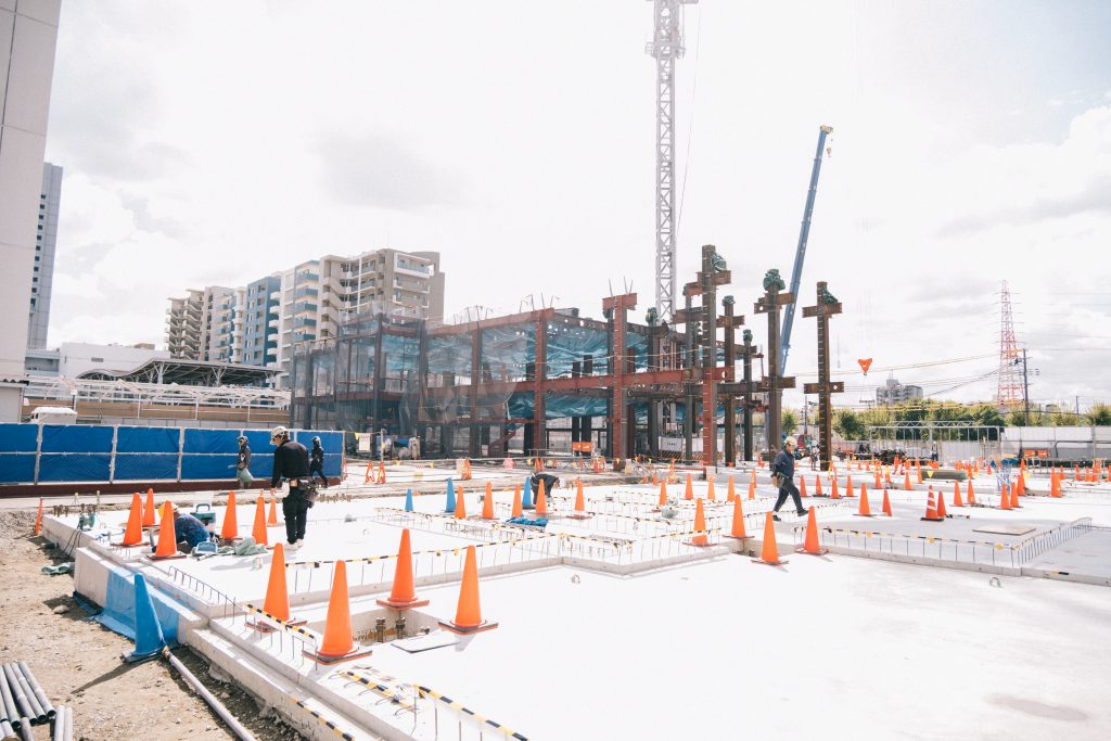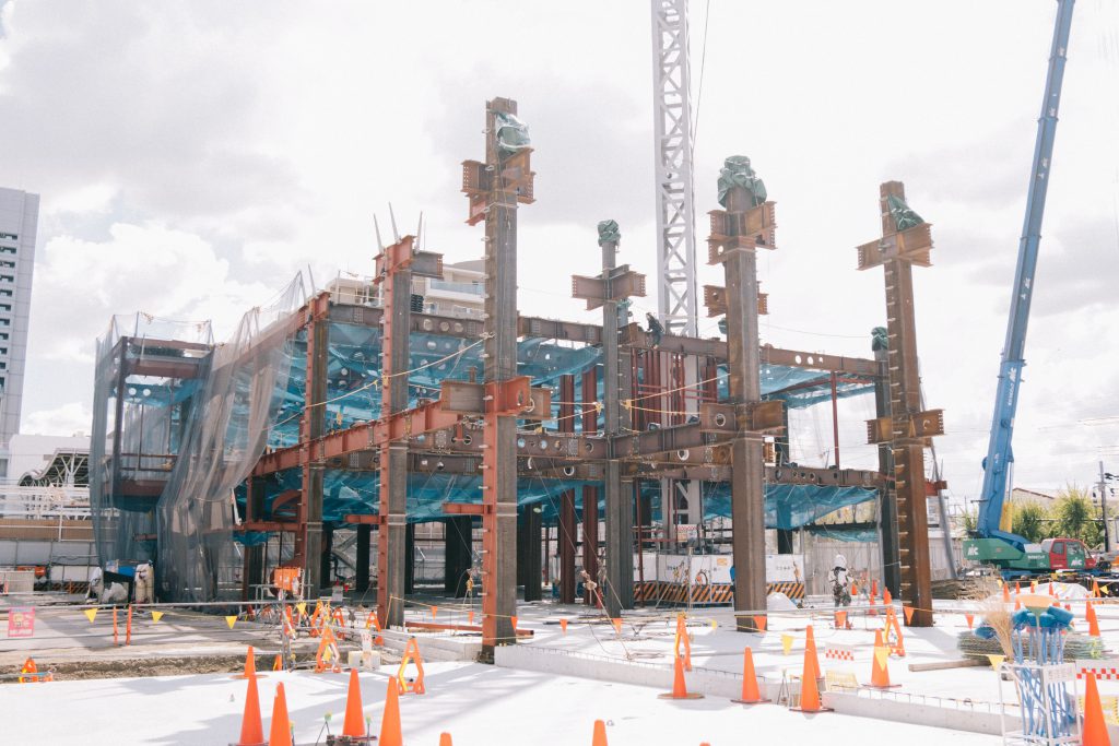 7月の見学から2か月——現場では地中・地表のコンクリート打設が完了し、その上に鉄骨が立ち上がってきました。現時点では南側の約半分まで組み上がり、3階部分の施工に着手しています。